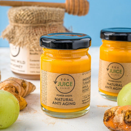 Buy Natural anti-aging power shot made from Fresh Amla, Turmeric and Honey. This Natural decoction is available to buy online for home delivery in...