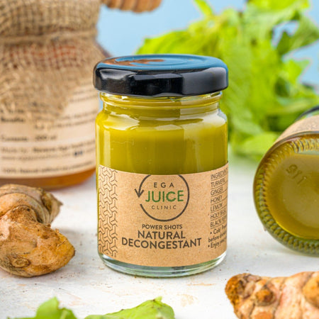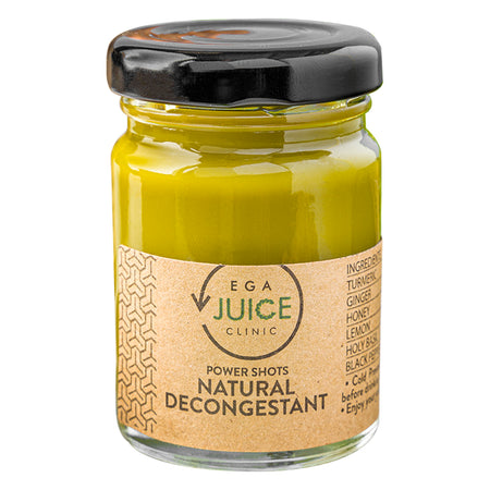 Natural Decongestant power shot made from Turmeric, Ginger, Honey, Lemon, Cayenne, Indian Tulsi (Mint), Black Pepper. This Natural decoction is available for home delivery...
